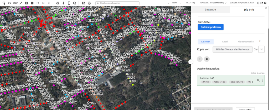 Um die eingegebenen Daten wertvoll und vollständig zu machen, führt das System einen Validierungsprozess durch. z.B. Hinzufügen einer Laterne: Prüfen, ob die Laternen an den Kabeln befestigt sind; Überprüfung der Korrektheit der Klemmen; Auf Kurzschluss prüfen; Überprüfen, ob die eingeführten Laternen über den Schrank mit Strom versorgt werden usw.