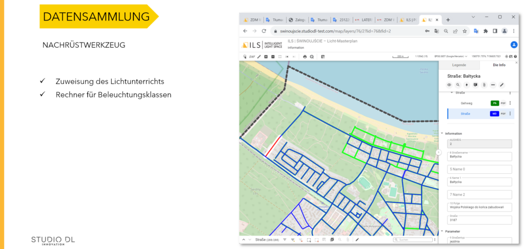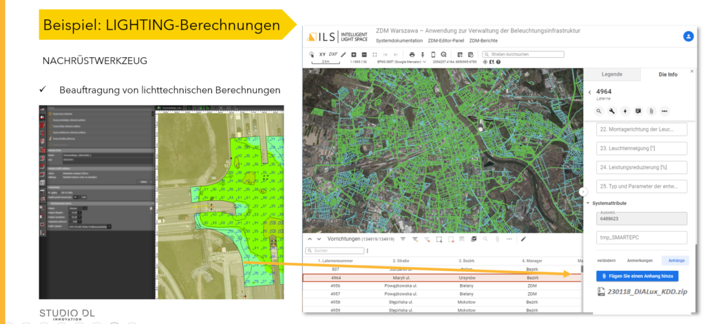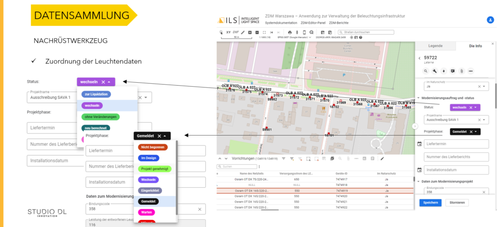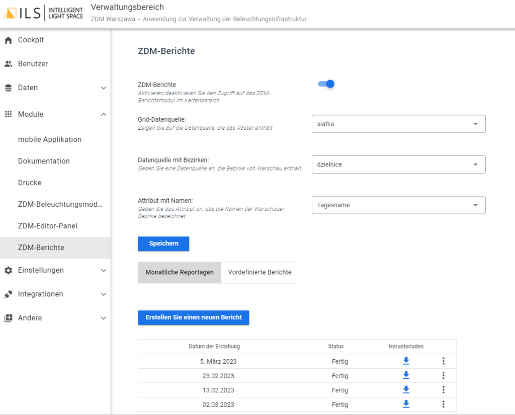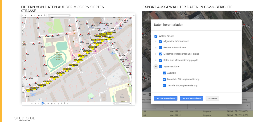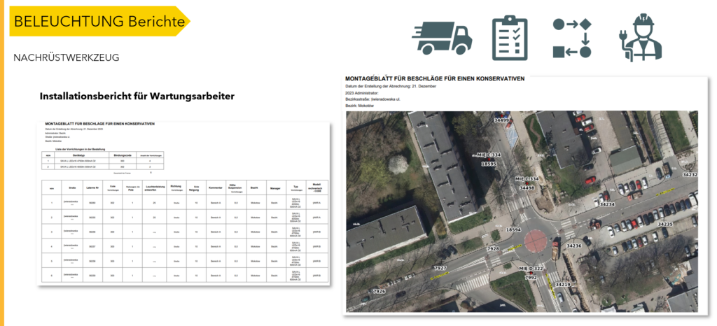 Der Bericht ist nicht derselbe. Jede Entität benötigt unterschiedliche Daten, sodass jeder mit einem Datensatz das bekommen kann, was er braucht. Nach der Auswahl der Leuchten/Daten, die modernisiert (also bestellt, hergestellt und installiert) werden sollen, können Sie diese entweder als CSV-Daten exportieren oder einen PDF-Bericht generieren. CSV-Daten können in Vorlagentabellen, z. B. in Excel, extrahiert werden, um einen Produktions- und Montagebericht zu erstellen. Allerdings wird der PDF-Bericht durch eine Kartenvorschau unterstützt, was ihn bei der Montage äußerst nützlich macht. Es besteht auch die Möglichkeit, einen vordefinierten Bericht zu erstellen. Die Daten für einen solchen Bericht werden aus dem Code und nicht vom Benutzer gefiltert. Er kann mehr Sammeldaten enthalten, z. B. eine Zusammenfassung der in einem bestimmten Monat installierten Leuchten, aufgeschlüsselt nach Straßen , Bezirke und Leuchtenarten.