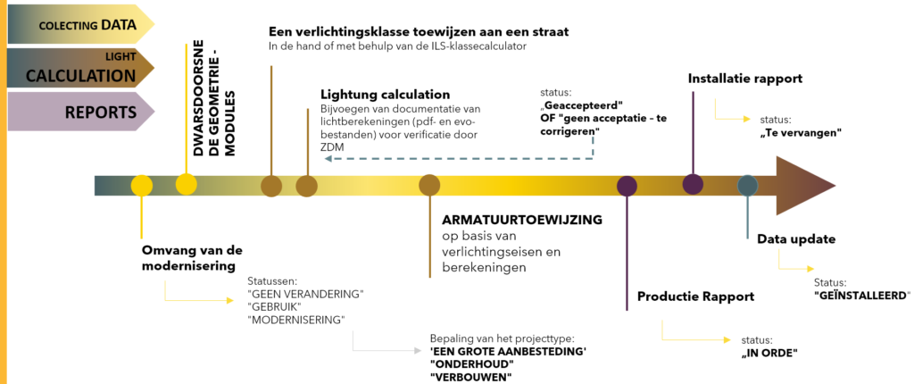 Hieronder kunt u het moderniseringsproces volgen. Over het geheel genomen is het een behoorlijk complex proces; er zijn veel subgroepen met verschillende achtergronden bij betrokken die geïnteresseerd zijn in verschillende gegevens en die veel aandacht vereisen en aan veel voorwaarden voldoen. Er zijn veel fasen, zoals het toewijzen van straatklassen, lichtontwerp – berekeningen, rapportage en installatie, die moeten worden voltooid, maar niet deze oude duivel! Dat is waar de ILS-applicatie voor is, om dit proces eenvoudiger te maken.