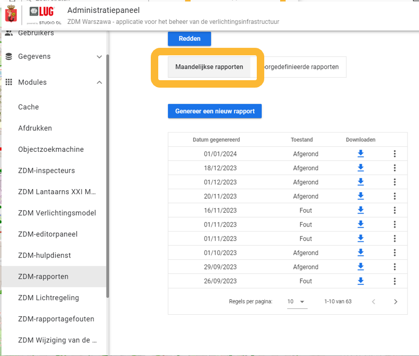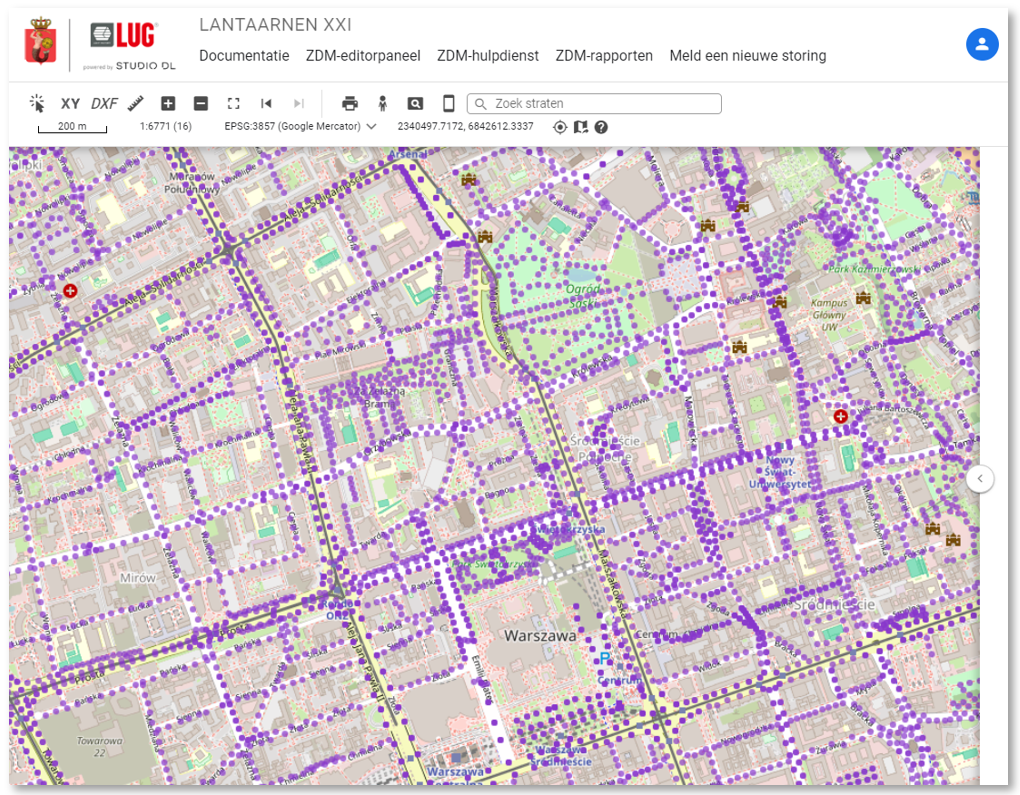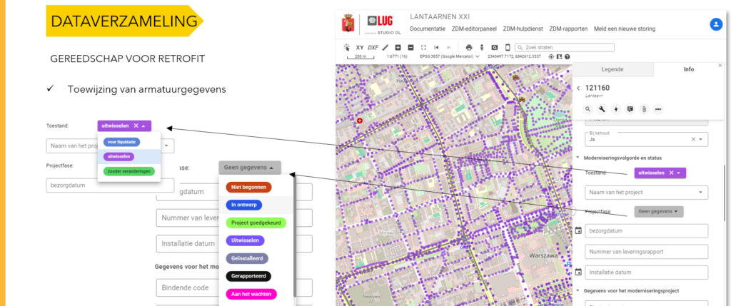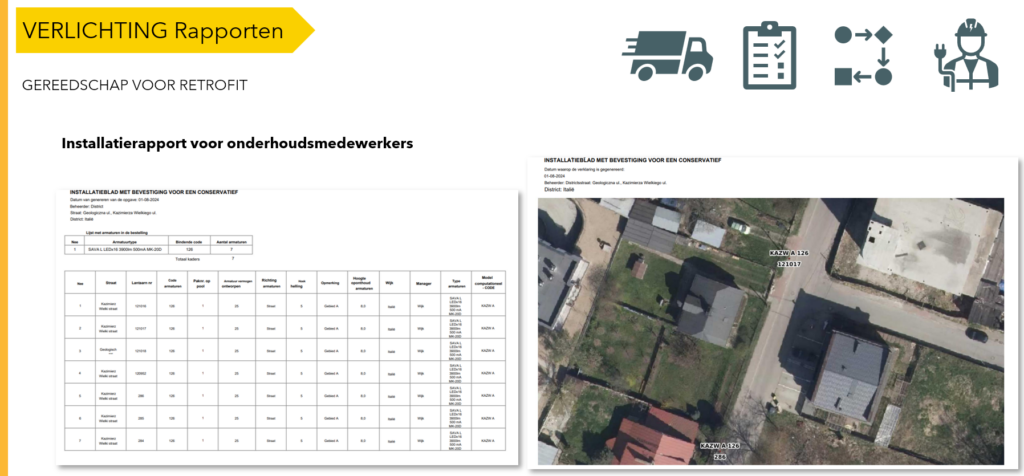 Het rapport is niet hetzelfde. Elke entiteit heeft andere gegevens nodig, zodat iedereen met één set gegevens kan krijgen wat hij of zij nodig heeft. Nadat u de armaturen/gegevens hebt geselecteerd die moeten worden gemoderniseerd (dat wil zeggen besteld, geproduceerd en geïnstalleerd), kunt u deze exporteren naar CSV-gegevens of een PDF-rapport genereren. CSV-gegevens kunnen worden geëxtraheerd in sjabloonspreadsheets, bijvoorbeeld in Excel, om een productie- en montagerapport te maken. Het PDF-rapport wordt echter ondersteund door een kaartvoorbeeld, wat het uiterst nuttig maakt tijdens de montage. Er is ook een optie om een vooraf gedefinieerd rapport te genereren. De gegevens voor een dergelijk rapport worden gefilterd op basis van de code en niet door de gebruiker. Het kan meer collectieve gegevens bevatten, bijvoorbeeld een samenvatting van de armaturen die in een bepaalde maand zijn geïnstalleerd, uitgesplitst naar straten , wijken en soorten armaturen.